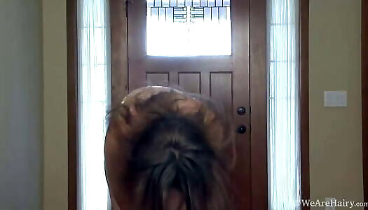 Hairy Camille unclothes naked and lays uber-sexy on the bone floor