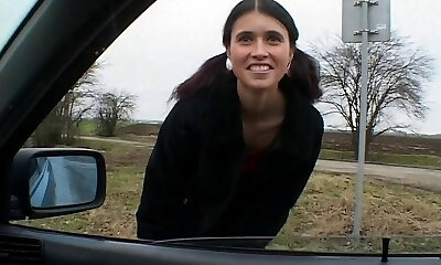Anhalterin zeigt ihre Titten und Snatch und pinkelt