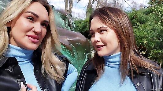 Lucky guy is having fun with two hot public flashing bitches