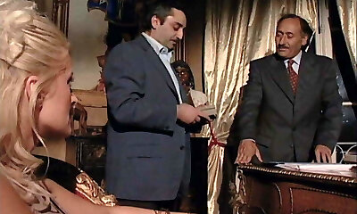 Sexy brunette is prominently treated by two dark-hued guards at once in a loud trio.